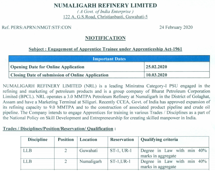 Job Post: Apprentice Trainee [Legal] @ Numaligarh Refinery Limited – Apply by March 10
